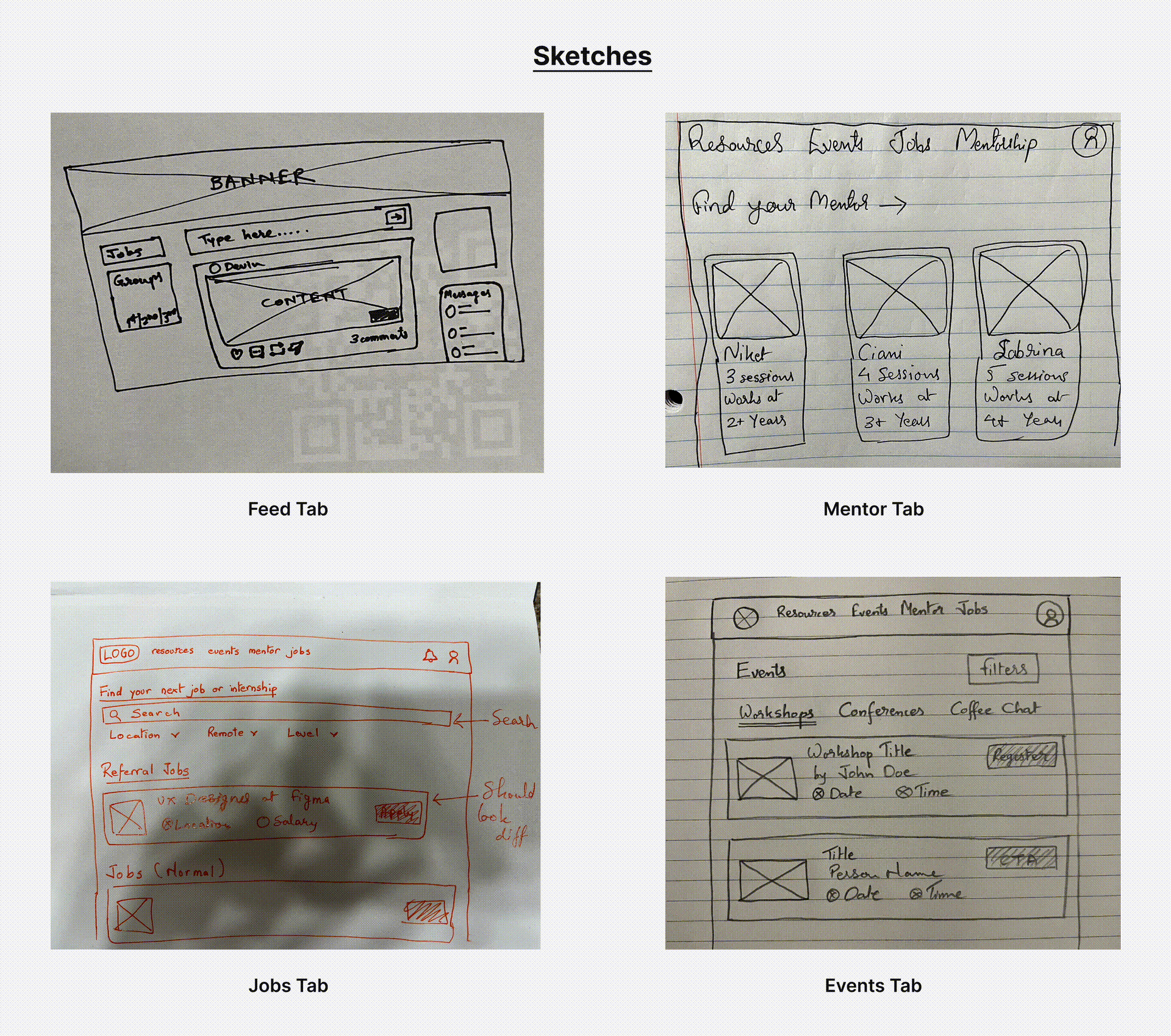 Navigate through user flows and interfaces, including the Feed, Mentorship, Jobs, Events, and Account tabs, to experience the platform’s seamless design and functionality.