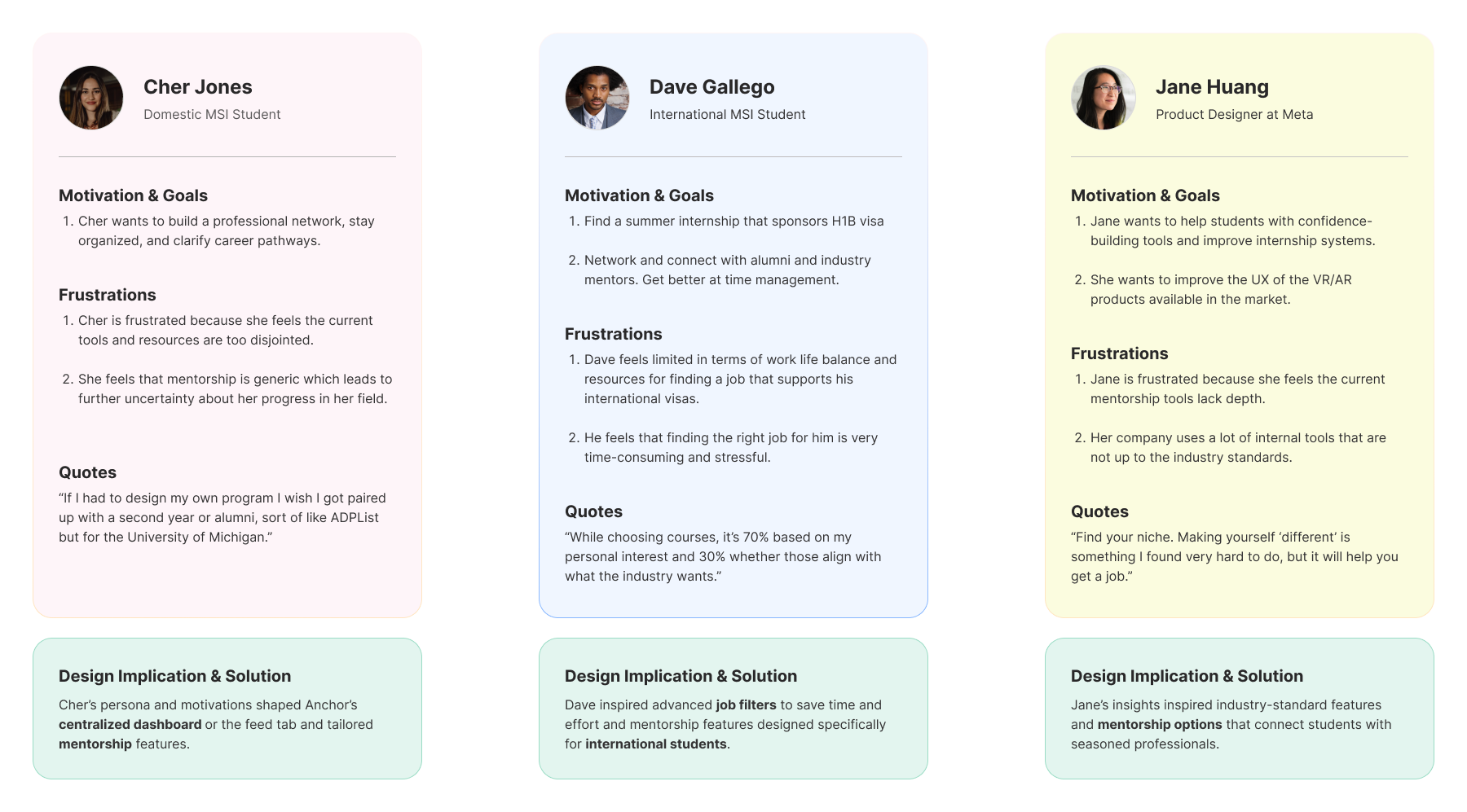 Design Implications: Cher’s persona shaped Anchor’s centralized dashboard and tailored mentorship features.