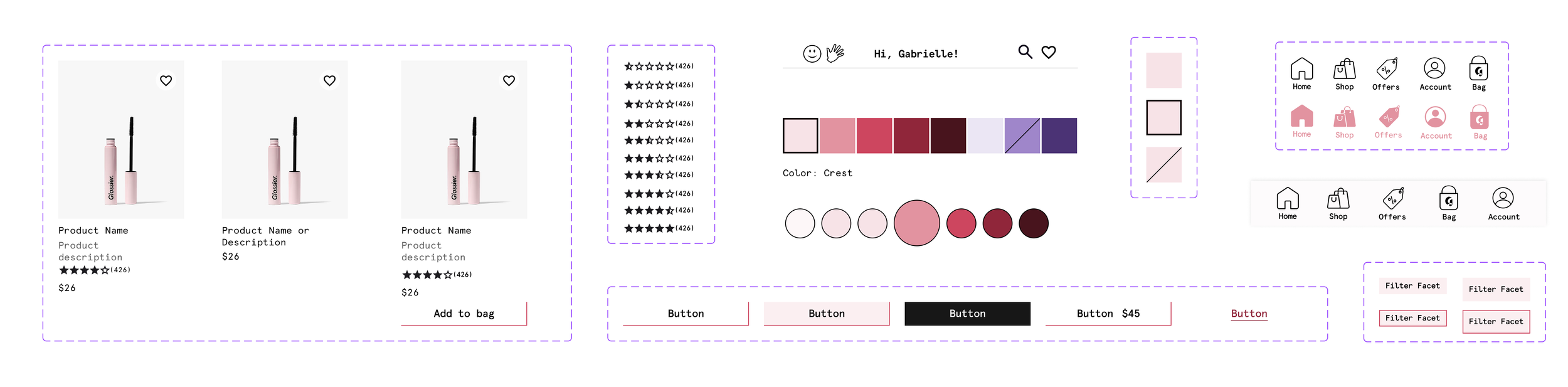 Creating wireframes not only helped me visualize what the app would look like, but it helped me determine what components I wanted to create and add to the design library. While creating the different components, I made sure to stay true to Glossier’s current brand identity.