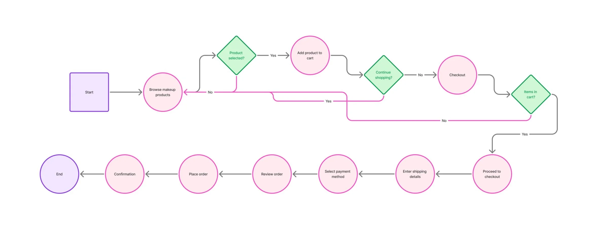 I created a user flow to map out the customer journey of Glossier’s new mobile application from browse to checkout.